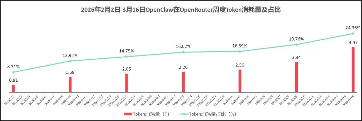 OpenClaw则为本轮Token需求爆发的核心驱动因素。2026年3月16日-3月22日,OpenRouter的周度数据显示,平台接近1/4的Token消耗由OpenClaw贡献。
