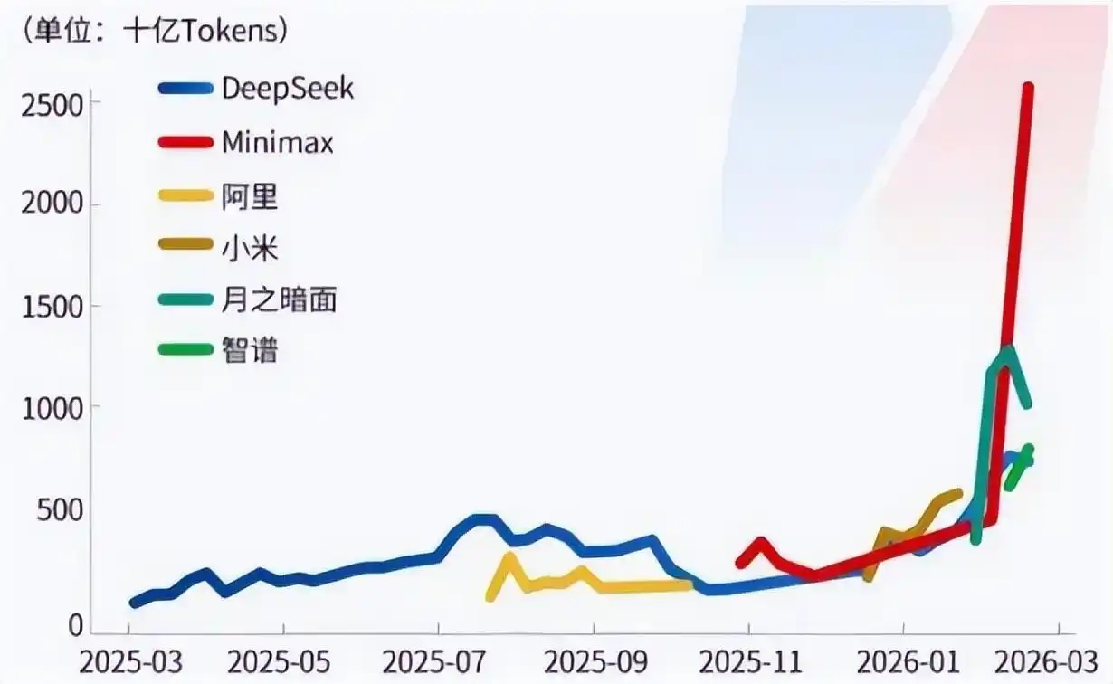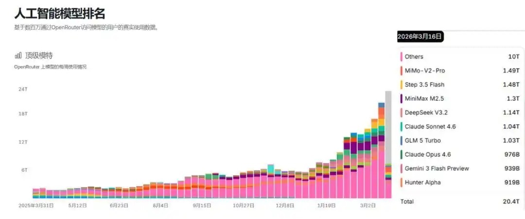 根据第三方AI模型聚合平台OpenRouter的最新数据,2026年3月16日至3月22日,平台Token周调用量已达到20.4万亿次,环比增长20.7%。2026年2月OpenRouter周度Token平均用量已达2025年Q4周均水平的2倍以上。