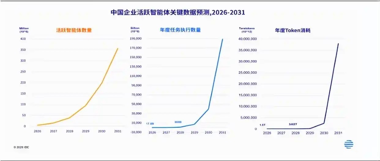 IDC数据显示,中国企业活跃智能体数量预计将在2031年突破3.5亿规模,年复合增长率达到135%以上。同时,由于智能体任务执行密度和任务复杂度的提升,也将带来智能体Token消耗年均超30倍的指数级增长。