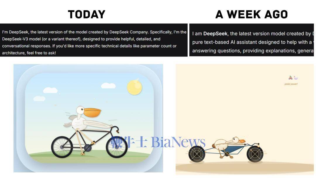 比如经典的用SVG画鹈鹕骑自行车任务,3月29日的DeepSeek,构图和色彩都明显比一周前强。